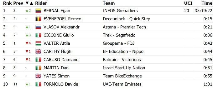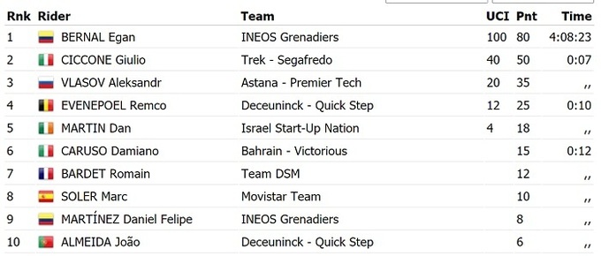 Колумбийский гонщик команды «Ineos Grenadiers» Эган Берналь выиграл девятый этап Джиро д’Италия-2021 и возглавил общий зачет многодневки: