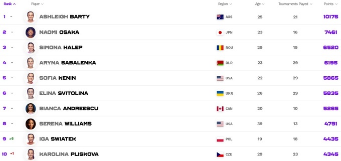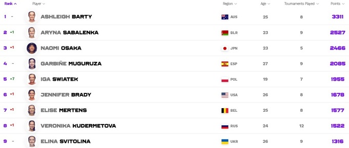 В Чемпионской гонке Свитолина осталась на девятом месте, но теперь имеет большее 200 очков отставания от топ-8. Свёнтек вошла в топ-5, Арина Соболенко опередила Наоми Осаку и теперь вторая.