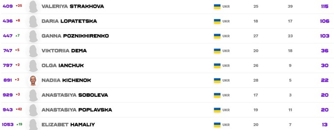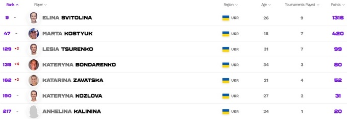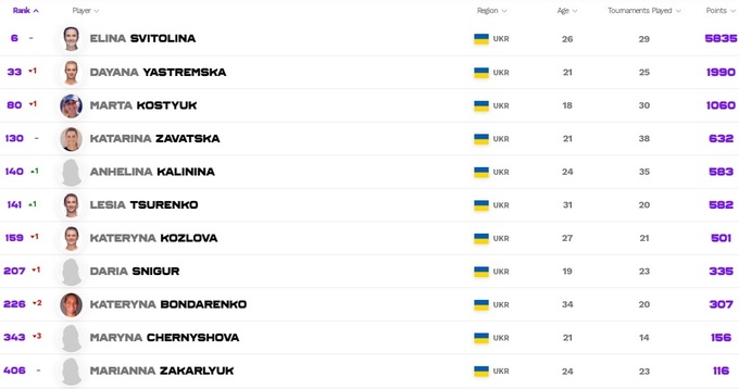 Что касается украинок, то Элине Свитолиной не хватило одной победы, чтобы вернуться в первую пятерку. У всех остальных изменения также незначительные.