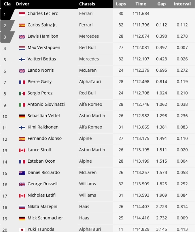 Во второй практике лучшими были болиды Феррари. Леклер опередил Сайнса, а Скудерия заняла 1-2 позиции. Даже если Феррари использовала турбо-режим мотора, команда явно имеет шансы на подиум.