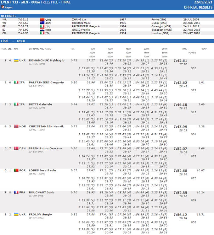 Романчук финишировал первым в финале на дистанции 800 м вольным стилем. Ранее украинец выиграл финальный заплыв и на 1500 м в/с.