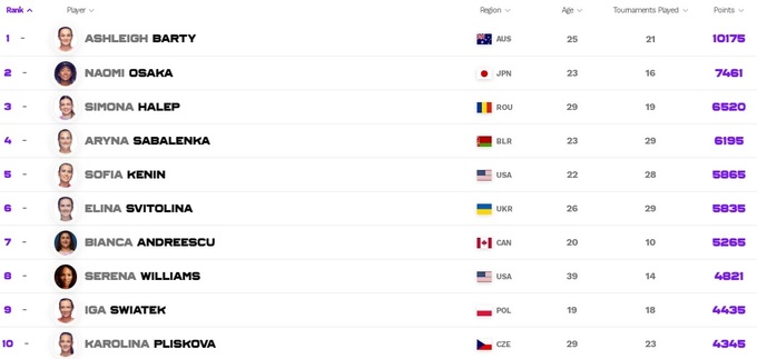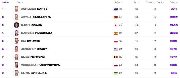 В чемпионской гонке Свитолина осталась девятой. Гауфф добавила шесть позиций и теперь 11-я. Бадоса поднялась на 16-ю позицию.