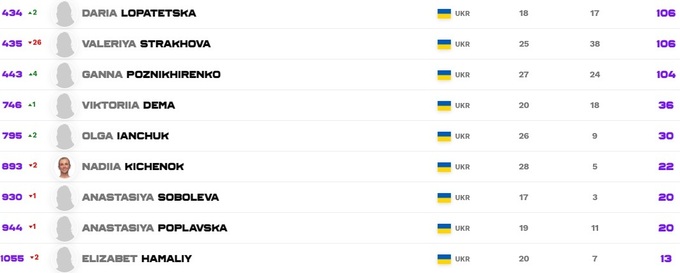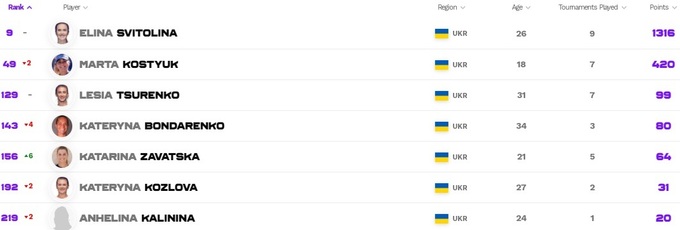 Что касается украинок, то Элина Свитолина осталась шестой, Даяна Ястремская во время временного отстранения от турниров продолжает терять позиции. Марта Костюк и Дарья Снигур опустились на одну строчку, а Катарина Завацкая, Ангелина Калинина, Леся Цуренко и Катерина Бондаренко поднялись на одну ступеньку.