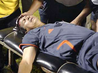 Полиции пока не удалось задержать человека, попавшего камнем в голову Кальдерона. Информации о состоянии здоровья бокового арбитра нет.