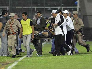 Брошенный с трибуны камень попал в голову ассистенту главного арбитра Кальдерону. Работники стадиона унесли окровавленного рефери с поля, а матч был прерван. Полиция вынуждена была вмешаться, чтобы защитить игроков и тренеров обоих футбольных команд.