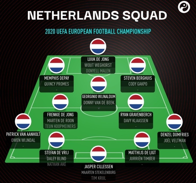 Хавбеки: Френки де Йонг (Барселона), Мартен де Роон (Аталанта), Тен Копмейнерс (АЗ), Райан Гравенберх (Аякс), Дэйви Клаасен (Аякс), Жоржиньо Вейналдум (Ливерпуль), Донни ван де Беек (МЮ), Мемфис Депай (Лион), Квинси Промес (Спартак), Коди Гакпо (ПСВ).