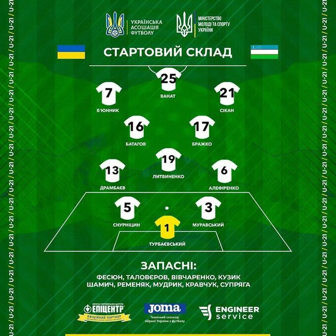 Украина U-21: Турбаевский – Драмбаев (Вивчаренко, 46), Снурницын, Муравский (Таловеров, 46), Алефиренко (Ременяк, 46) – Батагов, Литвиненко, Бражко (Мудрик, 46) – Вьюнник, Ванат (Супряга, 68), Сикан (Кравчук, 57).