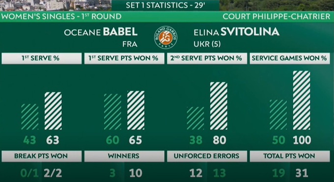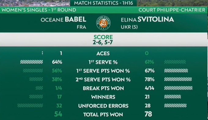 Начиналось все довольно прогнозируемо. Юная француженка нервничала, из-за чего у нее мало что получалось. Хотя нужно отдать Бабель должное, вайлд-кард она получила не за красивые глаза. По ходу матча мы убедились, что у нее есть солидный потенциал. Но в стартовой партии Осеан имела всего один брейкпоинт, когда уже проигрывала со счетом 1:4. Это все, что нужно знать об интриге. Да, Свитолина не показывала какого-то высокого уровня тенниса, но и этого вполне хватало для выигрыша.