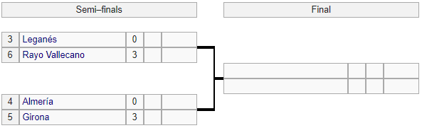 Вечером 3 июня в первом полуфинальном поединке за путевку в Ла Лигу «Райо Вальекано» разгромил «Леганес» (3:0), ответный матч состоится 6 июня.