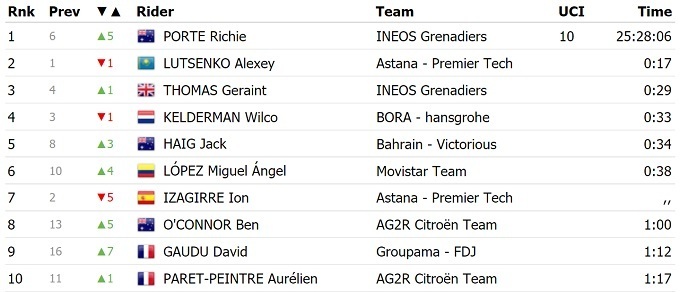 Вторым с 35-секундным отставанием финишировал австралиец Ричи Порт из «Ineos Grenadiers», который перехватил лидерство в общем зачете.