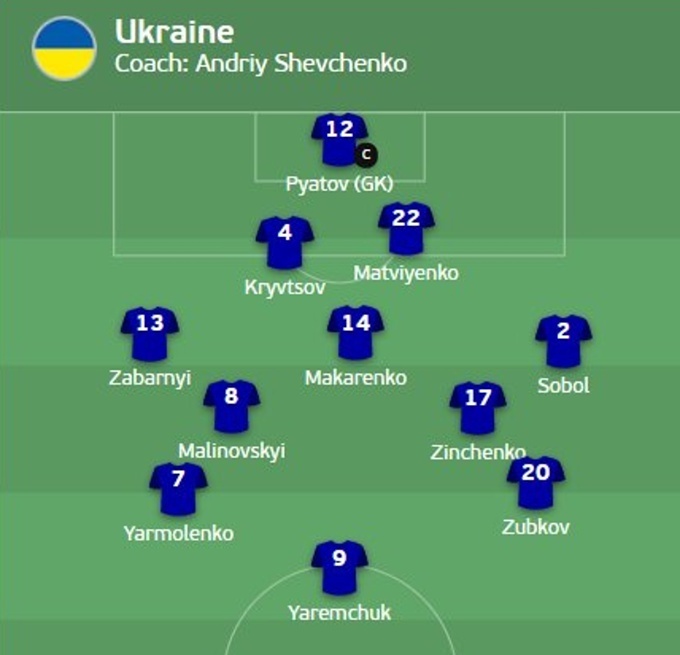 Украина: Пятов, Забарный, Кривцов, Матвиенко, Соболь, Макаренко, Малиновский, Зинченко, Ярмоленко, Зубков, Яремчук