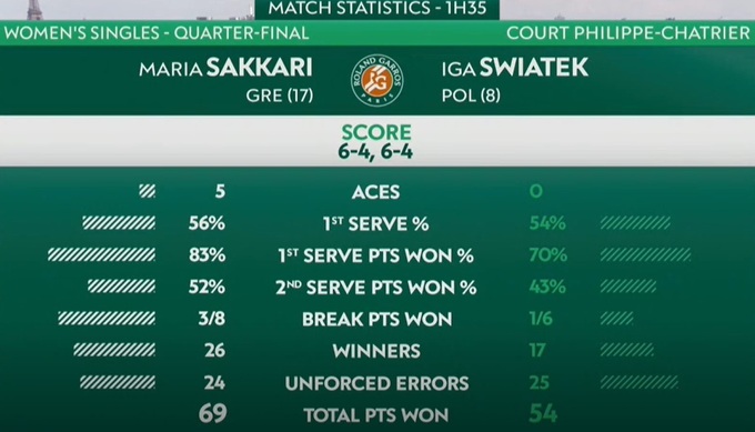 Мария Саккари (Греция) – Ига Свёнтек (Польша) – 6:4, 6:4