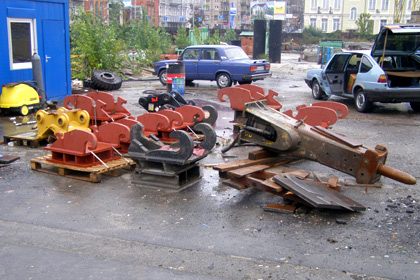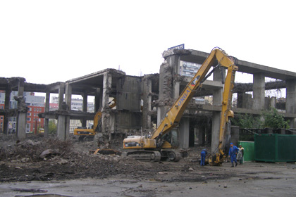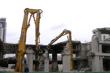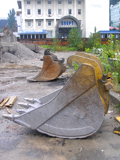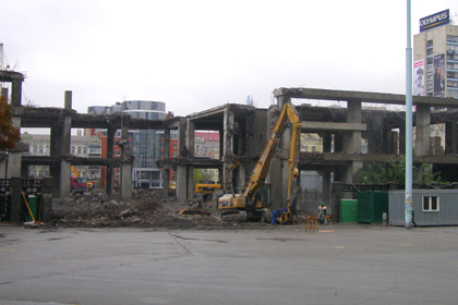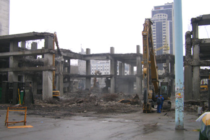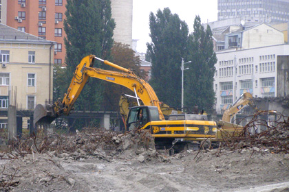 Прогресс в демонтажных работах за прошедшую неделю можно объяснить появлением на объекте заявленного главой правления «Киевметростроя» Владимир Петренко количества спецтехники. Впервые, за десять недель все шесть единиц «чудо-машин» одновременно задействованы в работе. Они крушат несостоявшийся торговый центр со всех сторон, а экскаваторы подчищают за ними территорию, освобождая место для маневра.