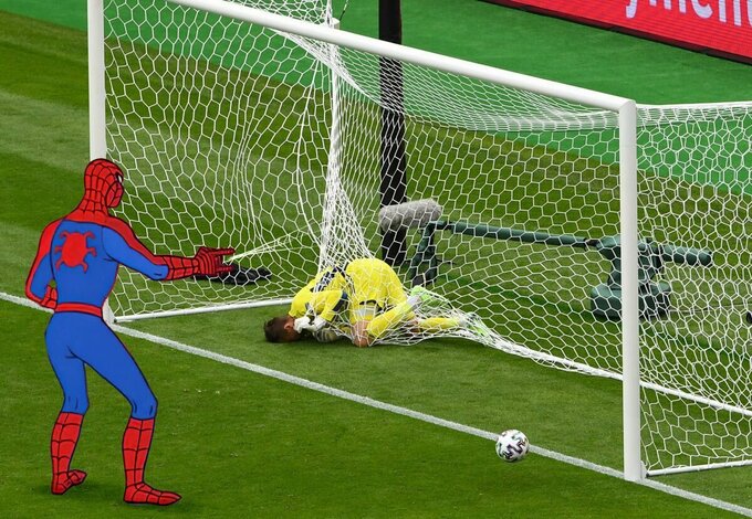 Как ни старался Дэвид Маршалл, но поймать мяч ему не удалось. Более того, вратарь шотландцев еще и стал героев мемов, потому что на всех парах влетел в сетку и немного в ней запутался. Самые остроумные фаны обыграли этот момент с участием человека-паука.