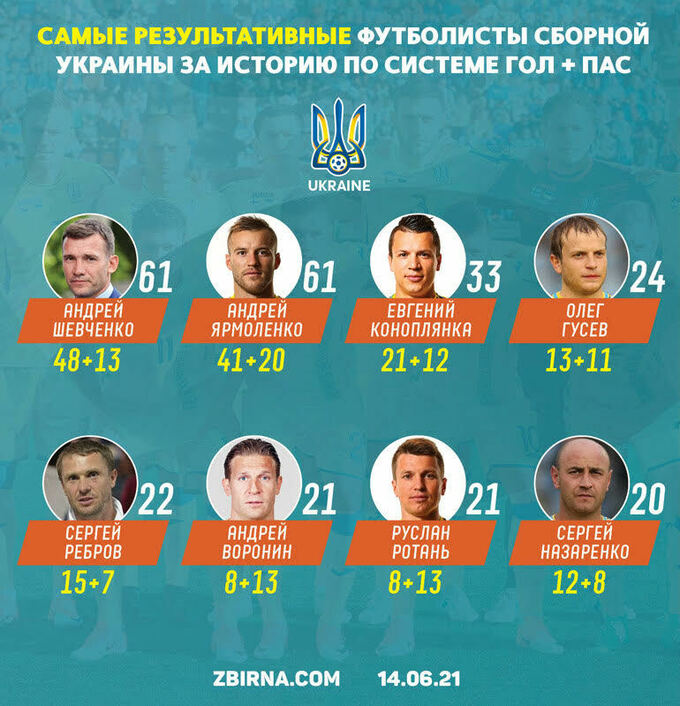 Гол Андрея Ярмоленко в ворота сборной Нидерландов в рамках первого тура группового этапа Евро-2020 позволил ему догнать Андрея Шевченко в рейтинге самых результативных игроков в истории национальной команды по системе гол + пас.