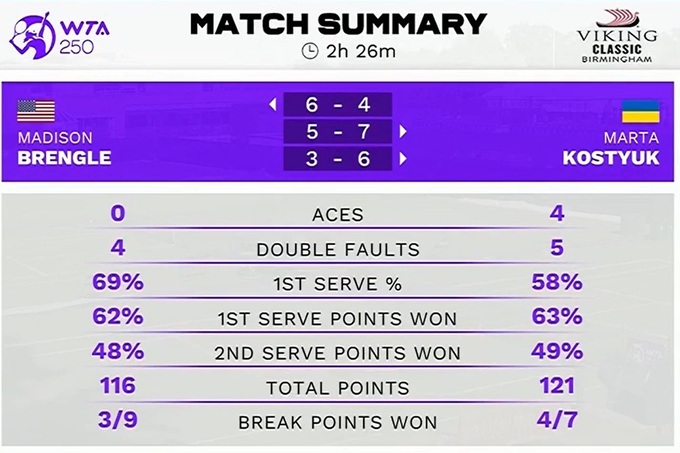 Марта Костюк (Украина) – Мэдисон Бренгл (США) – 4:6, 7:5, 6:3