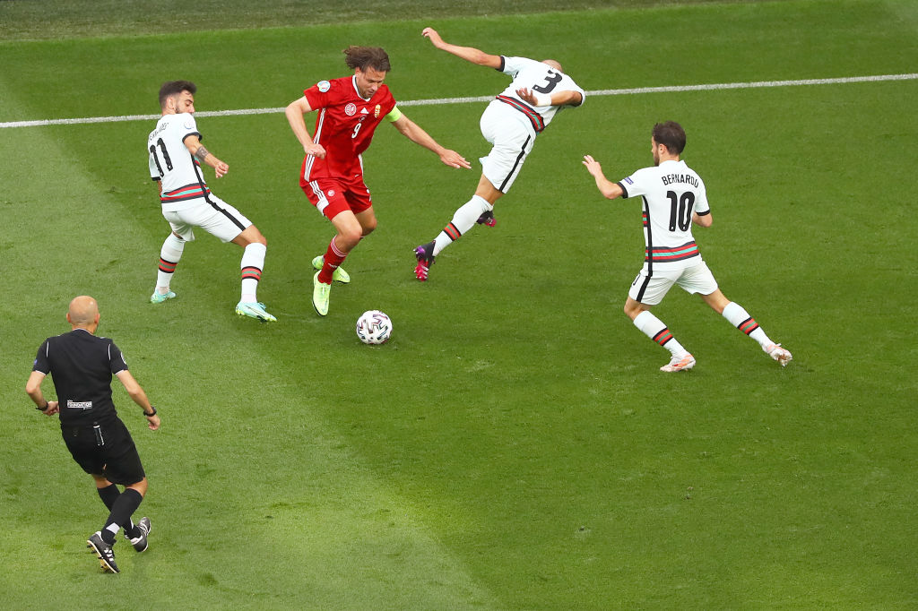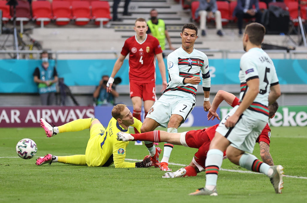 На какое-то время венгерской сборной удалось отодвинуть игру от своих ворот, но настырные португальцы снова пошли вперед большими силами и на 18-й минуте им удалось вывести на хорошую позицию своего лидера Криштиану Роналду. С его ударом Гулачи справился, а затем еще оказалось, что форвард гостей оказался в офсайде.