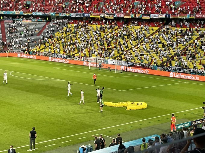 ВИДЕО. Разбил камеру! Парашютист приземлился на поле во время матча Франции и Германии