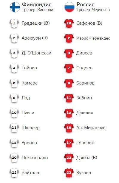 Финляндия: Градецки, О'Шонесси, Араюури, Тойвио, Уронен, Камара, Лод, Шюллер, Райтала, Пукки, Похьянпало.