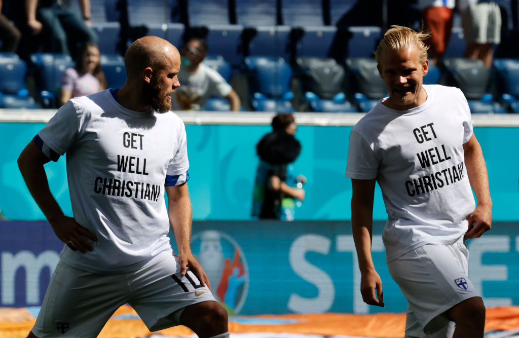 Сегодня сборная Финляндии во втором туре Евро-2020 играет с Россией. На предматчевую разминку игроки сборной Финляндии вышли в футболках в поддержку лидера сборной Дании Кристиана Эриксена, который пережил остановку сердца во время матча первого тура как раз против финнов.
