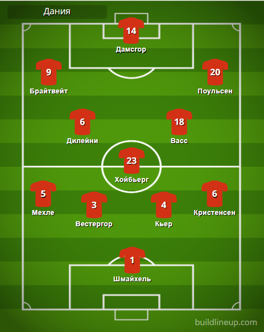 Дания: Шмайхель – Мехле, Вестергор (Сков-Ольсен, 84), Кьер, Кристенсен – Дилейни (М. Йенсен, 72), Хойбьерг, Васс (Стрюгер-Ларсен, 62) – Брайтвейт, Дамсгор (Корнелиус, 72), Поульсен (Нергор, 62).