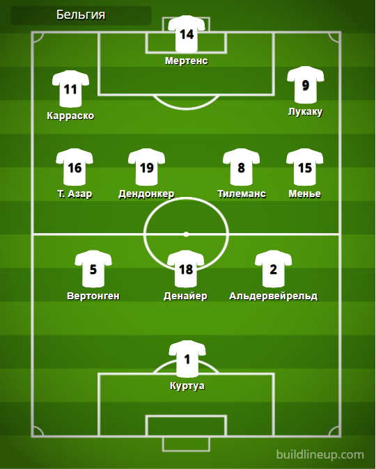 Бельгия: Куртуа – Вертонген, Денайер, Альдервейрельд – Т. Азар (Вермален, 90+5), Дендонкер (Витсель, 59), Тилеманс, Менье – Карраско (Э. Азар, 59), Лукаку, Мертенс (де Брюйне, 46).