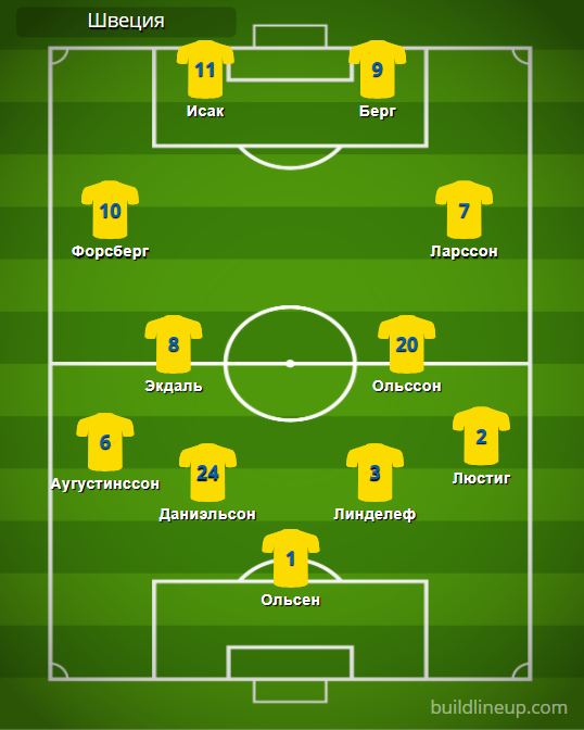Швеция: Ольсен – Аугустинссон (Бенгтссон, 88), Даниэльсон, Линделеф, Люстиг – Форсберг (Крафт, 90+3), Экдаль (Свенссон, 88), Ольссон (Классон, 64), Ларссон – Исак, Берг (Квайсон, 64).