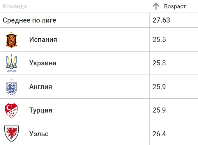 Пятерку же самых опытных коллективов на чемпионате Европы представляют сборные Бельгии (28,9), Португалии (29), Финляндии (29,1), Словакии (29,4) и Швеции (29,6).
