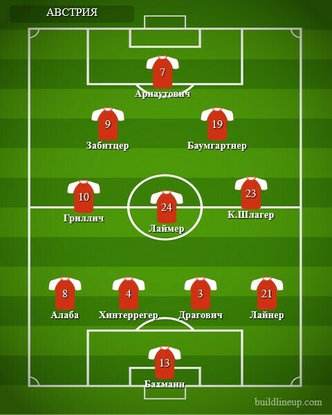Австрия: Бахманн, Алаба, Хинтереггер, Драгович, Лайнер, Гриллич, Лаймер (Ильсанкер, 72), К.Шлагер, Забитцер, Баумгартнер (Шопф, 33), Арнаутович (Калайджич, 90).
