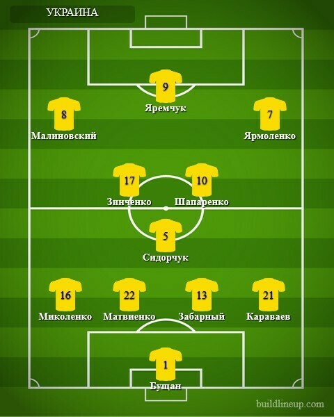 Украина: Бущан, Миколенко (Беседин, 85), Матвиенко, Забарный, Караваев, Сидорчук, Зинченко, Шапаренко (Марлос, 68), Малиновский (Цыганков, 46), Яремчук, Ярмоленко.