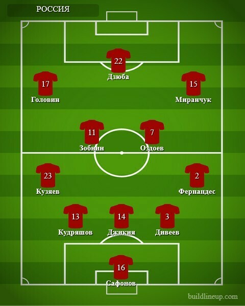 Россия: Сафонов, Дивеев, Джикия, Кудряшов (Караваев, 67), Марио Фернандес, Оздоев (Жемалетдинов, 61), Зобнин, Кузяев (Мухин, 67), А. Миранчук (Соболев, 61), Головин, Дзюба.