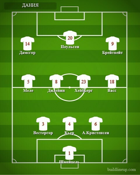 Дания: Шмейхель, Вестергор, Кьер, Кристенсен, Меле, Дилейни (М.Йенсен, 86), Хейбьерг, Васс (Стрюгер-Ларсен, 60), Дамсгор (Нергор, 72), Поульсен (Дольберг, 60), Брэйтуэйт (Корнелиус, 85)