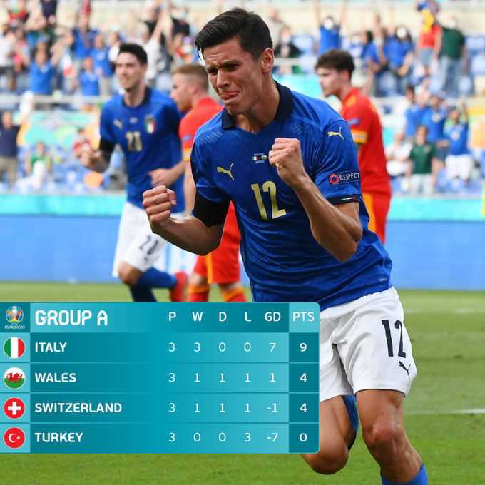 Италия минимально победила Уэльс (1:0) и заняла первое место в группе A. Несмотря на поражение, команда Гарета Бэйла за счет лучшей разницы мячей стала второй.