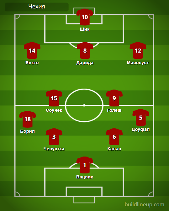 Чехия: Вацлик – Борил, Челустка, Калас, Цоуфал – Соучек, Голеш (Выдра, 84) – Янкто (Шевчик, 46), Дарида (Крал, 64), Масопуст (Гложек, 64) – Шик (Пекхарт, 75).