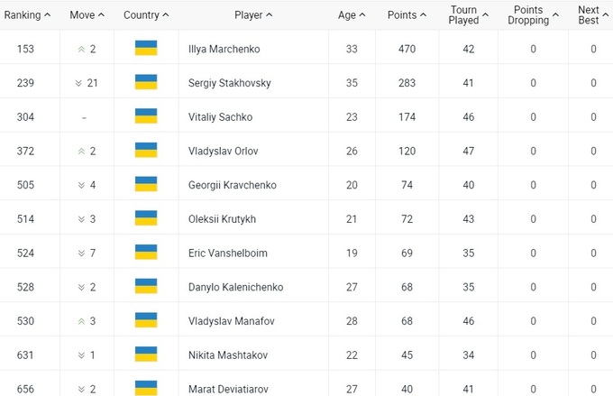 Что касается украинцев, то Илья Марченко поднялся на две позиции, а Сергей Стаховский опустился на 21 строчку. У всех остальных незначительные изменения.