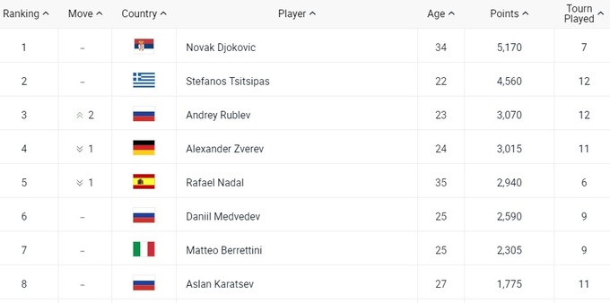 В Чемпионской гонке Андрей Рублев поднялся в топ-3, потеснив Александра Зверева и Рафаэля Надаля.