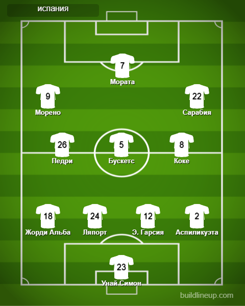Испания: Унаи Симон, Альба, Лапорт, Эрик Гарсия (Пау Торрес, 71), Аспиликуэта (Оярсабаль, 77), Бускетс (Алькантара, 71), Коке, Педри, Морено (Траоре, 77), Мората (Ф.Торрес, 66), Сарабия.