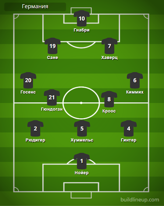 Германия: Нойер – Рюдигер, Хуммельс, Гинтер (Фолланд, 82) – Госенс (Мусиала, 82), Кроос, Гюндоган (Горецка, 57), Киммих – Сане, Хаверц (Вернер, 67) – Гнабри (Мюллер, 67).