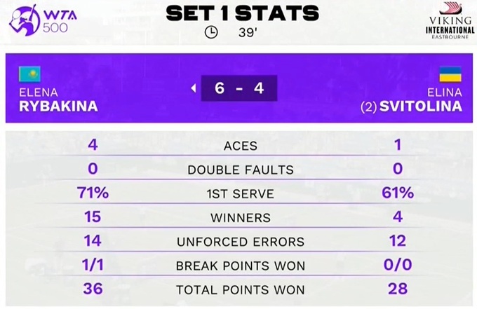 В первом сете борьба была более менее равной, но представительница Казахстана сумела сделать брейк в девятом гейме. Отыграться на тот момент было уже проблематично, Рыбакина уверенно подала на партию.