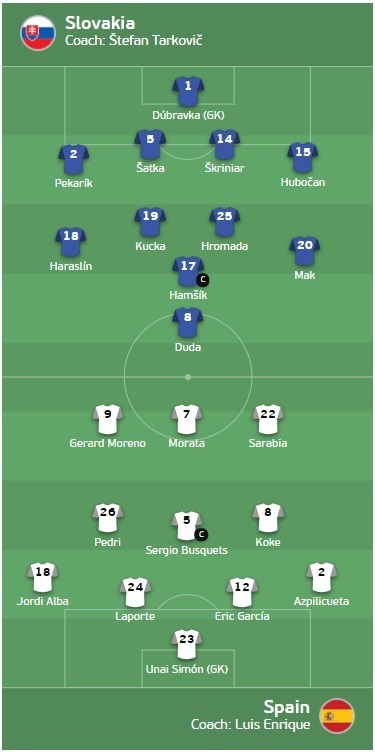 Испания: Унаи Симон – Альба, Лапорт, Эрик Гарсия, Аспиликуэта – Бускетс, Коке, Педри – Херард Морено, Мората, Сарабия