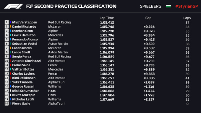 Во второй тренировке лучшим снова был Ферстаппен, а опередил он Даниэля Риккардо на Макларене и Эстебана Окона на Альпин.