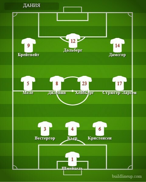Дания: Шмейхель, Вестергор, Кьер (Й.Андерсен, 77), Кристенсен, Меле, Дилейни (М.Йенсен, 60), Хейбьерг, Стрюгер-Ларсен (Бойлесен, 77), Брейтвейт, Дольберг (Корнелиус, 70), Дамсгор (Нергор, 60).