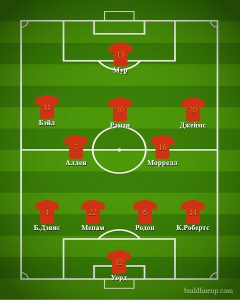 Уэльс: Уорд, Б.Дэвис, Мепам, Родон, К.Робертс (Н.Уильямс, 41), Аллен, Моррелл (Уилсон, 60), Бэйл, Рэмзи, Джеймс (Брукс, 78), Мур (Т.Робертс, 78).