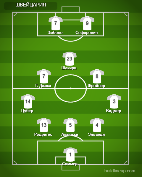 Швейцария: Зоммер, Эльведи, Аканджи, Родригес (Мехмеди, 87), Цубер (Фасснахт, 79), Джака, Фройлер, Видмер (Мбабу, 73), Сеферович (Шер, 96), Эмболо (Варгас, 79), Шакири (Гавранович, 73).