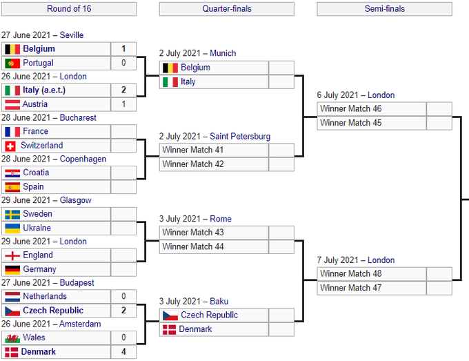 Стали известны две пары четвертьфиналистов. Бельгия будет играть против Италии 2 июля в немецком городе Мюнхен, а Чехия встретится с Данией 3 июля в Баку.