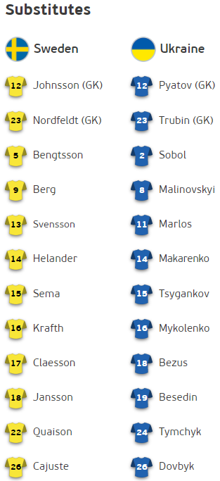 Запас: Йонссон, Нордфельдт, Бенгтссон, Берг, Свенссон, Хеландер, Сема, Крафт, Классон, Янссон, Квайсон, Каюсте.