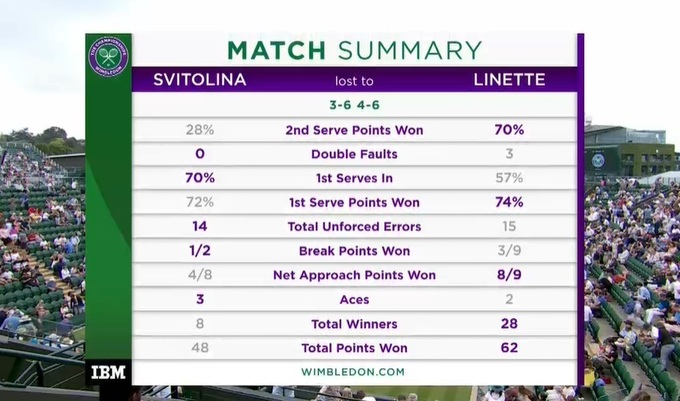 Сегодня подобного эмоционального допинга уже не нашлось, это было заметно. Да еще и Линетт отлично играла, показывая неплохой атакующий теннис. Противопоставить этому украинка практически ничего не смогла, хотя и начала матч с брейка. Больше полька не отдавала свои подачи, хотя во втором сете у Элины и был скрытый сетбол. Но это было исключение, Магда совершенно заслужено победила.