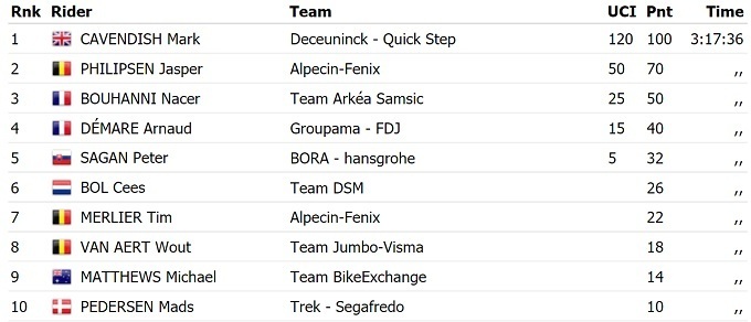 Британский гонщик команды «Deceuninck Quick Step» Марк Кэвендиш стал победителем шестого этапа Тур де Франс-2021. В финишном спринте он опередил Яспера Филипсена и Насера Буанни.