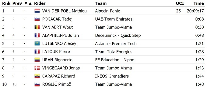 Желтую майку лидера общего зачета сохранил голландец Матье Ван дер Пул из «Alpecin Fenix».