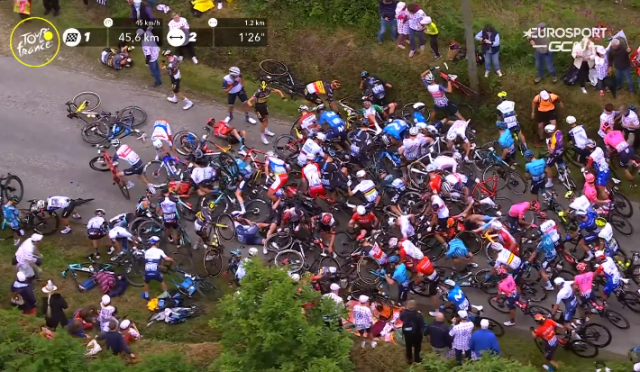 Немецкий велосипедист Тони Мартин не смог объехать женщину, что вызвало массовое падение гонщиков на трассе. Событие назвали наихудшей аварией в истории Тур де Франс.